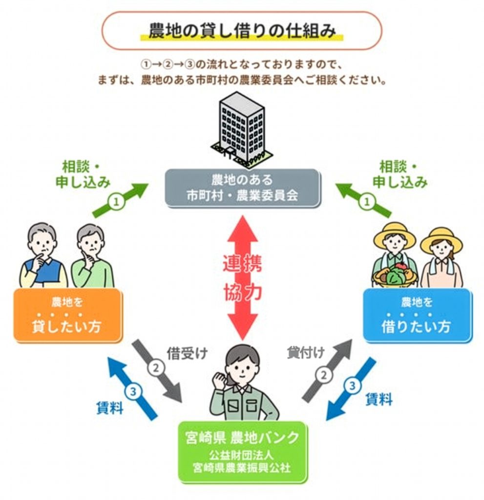 また、宮崎県では県内の市町村等に農地中間管理事業の業務の一部を委託しており、貸借の相談、対象農地の確認、関係書類の作成等関係機関・団体との連携を図っています。